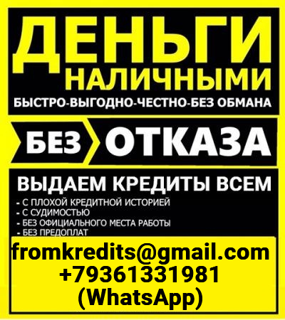 Кредит наличными без подтверждения дохода, занятости и поручителей! Любые суммы до 5 млн. рублей на различные цели. За подготовку недостающих документов оплаты не берем! Только выгодные условия с минимальными требованиями. Кредитная история допускается любая (от нулевой до черного списка). Возрастные ограничения 18-65 лет. Работаем с регионами! Предоставляем гарантии, которые другие предоставить не могут! Обращайтесь, если уверены в своей платёжеспособности в любое время! Заявки принимаем по электронной почте и контактному телефону(WhatsApp).